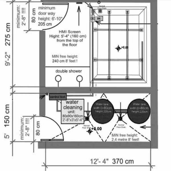 Необходимо предусмотреть напольный дренаж под кабиной и в техническом помещении. В помещении флотария, возможно, потребуется установить душевую кабину и раковину для мытья рук с горячей и холодной водой. Для опциональной системы back-wash так же необходим слив рядом с капсулой. |