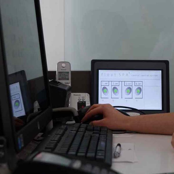 ЖК-дисплей с сенсорным экраном, установка внутри помещения флоатинга, встроенная программа флотации. Настройка температуры воды, параметры системы очистки воды, контроль света, аромата и звука. Удаленный доступ технических специалистов к программному обеспечению через Интернет. Дополнительная центральная система для управления несколькими капсулами Флоат СПА с одного большего дисплея на стойке регистрации. |