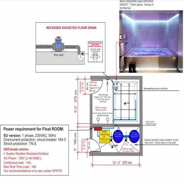 Идеально, когда ,бассейн, душ и технический блок размещаются в одном помещении (Рекомендуемые размеры комнаты около 17 м² 4250 х 3700 мм, высота 2300 мм). При этом, лучше отделить техническое помещение, где размещается резервуар для воды и тех. модуль от комнаты для флотации (рекомендуемые размеры тех. помещения 1200 х 3500, высота 2300). Сама комната, в которой размещается капсула и душ: 2750 х 3700, высота 2300 (около 10 м²). Для проноса оборудования необходимо обеспечить проем размером не менее 800 мм в ширину (лучше 900 мм) x 2050мм см в высоту с достаточным для разворота размером и высотой коридора. Необходима полная звуко- и световая изоляция помещения флоатинга.